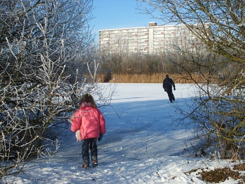 Kijken naar de schaatsers op het meer. Vrijdag 9 januari 2009