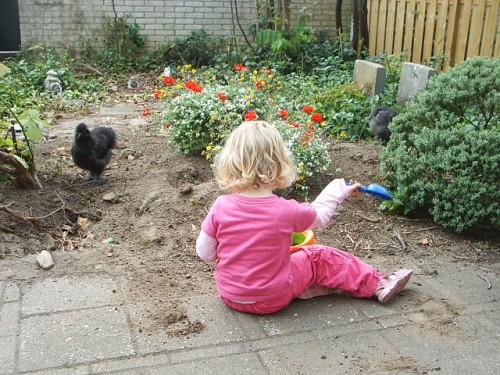 Lekker spelen, kippevriendje kijkt toe. Dit was mei 2007